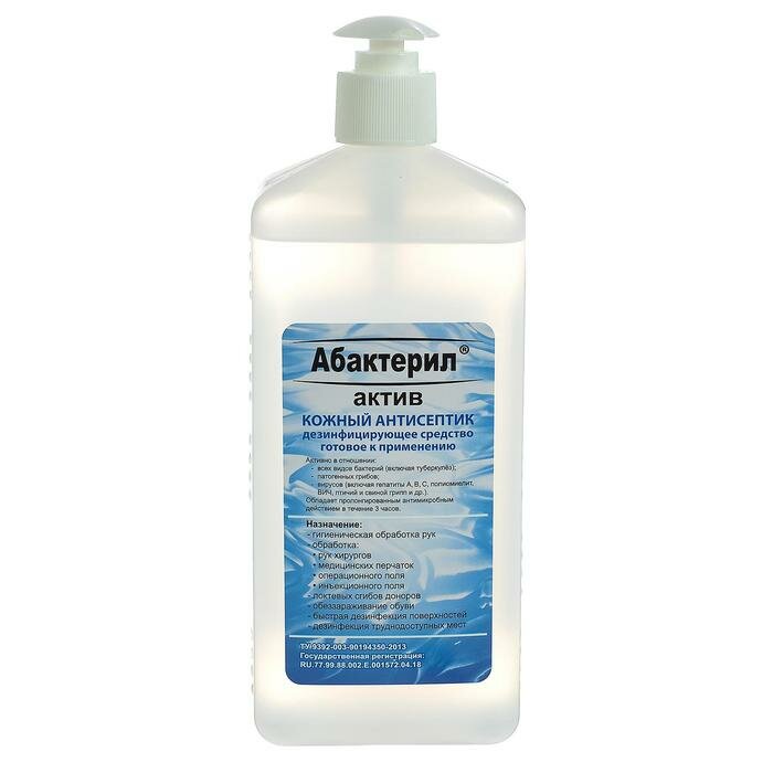20 шт. Кожный антисептик с вирулицидной активностью ГОСТ 12.1.007-76 Абактерил-Актив с насос-дозатором 1 л.