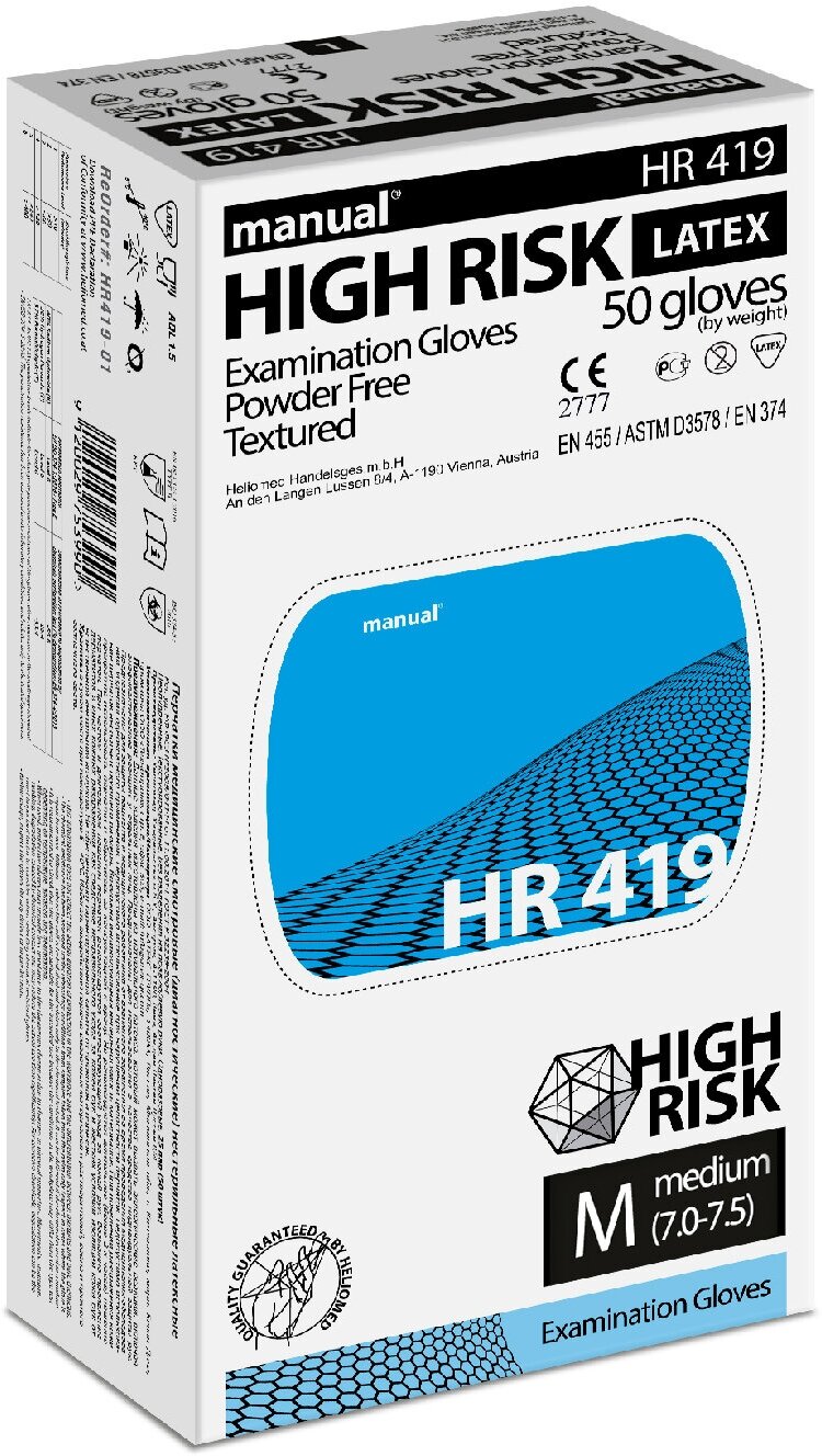 Перчатки латексные смотровые MANUAL HIGH RISK HR419 Австрия, 25 пар (50 шт.), размер L (большой) Комплект : 1 шт .
