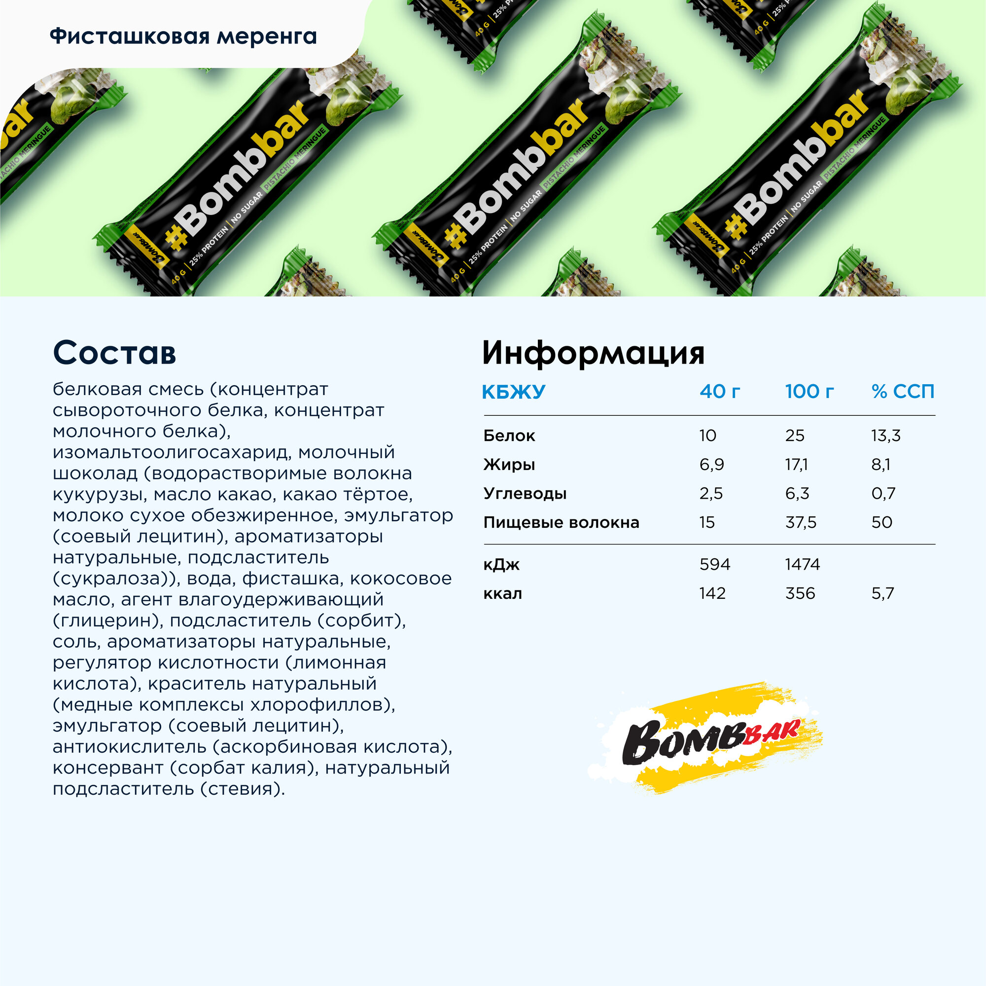 СохранитьBombbar Протеиновый батончик шоколаде без сахара "Фисташковая меренга", 30шт х 40г. интересное: