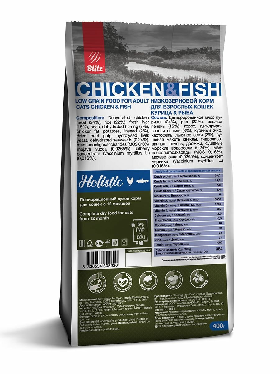 Корм Blitz Holistic Chicken & Fish (низкозерновой) для кошек, курица и рыба, 400 г