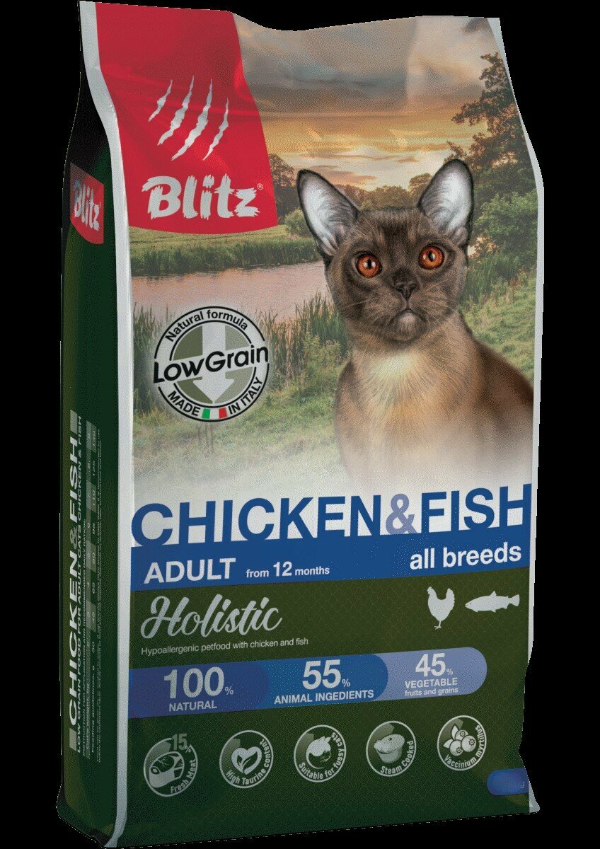 BLITZ HOLISTIC CHICKEN & FISH низкозерновой корм для взрослых кошек всех пород, Курица/Рыба 5кг.