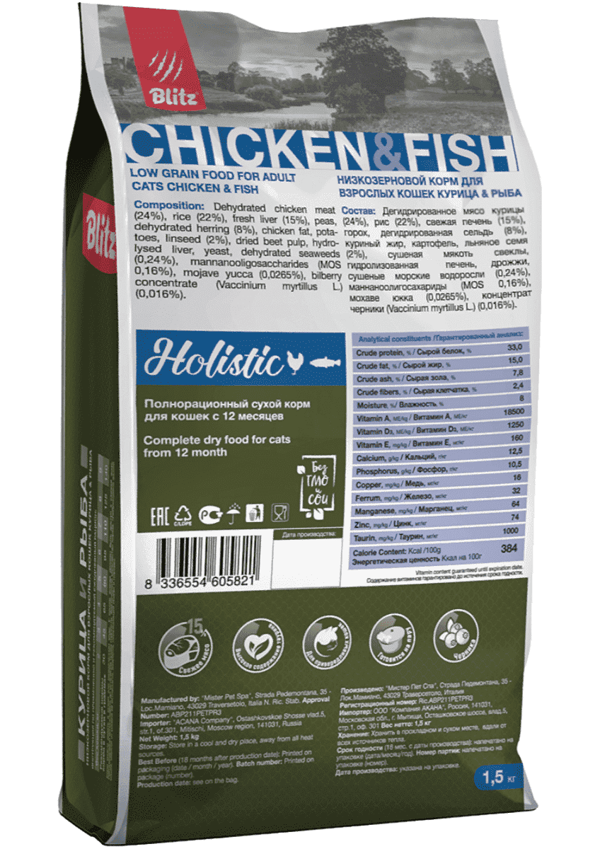 Blitz Holistic Chicken & Fish Cat All Breeds (Low Grain) низкозерновой корм для кошек всех пород с курицей и рыбой 1,5 кг