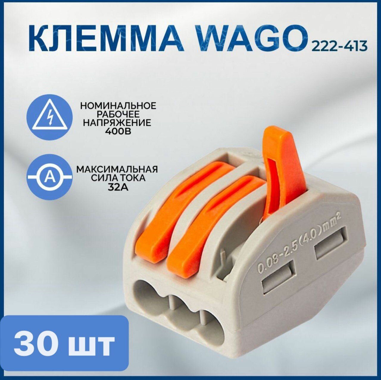 Клемма WAGO 222-413, трехконтактная, 30 шт
