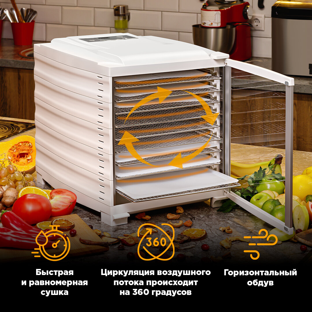 Второй год пользуюсь этим дигедратором.Очень нужная вещь для тех у кого есть сад и огород.Просто в управлении.ничего лишнего.удобно в использовании.Докупила до 10 лотков для пастилы. В ночь поставила и голова не болит.Столько рецептов перепробовала...одни вяленые помидоры и слива чего стоят.