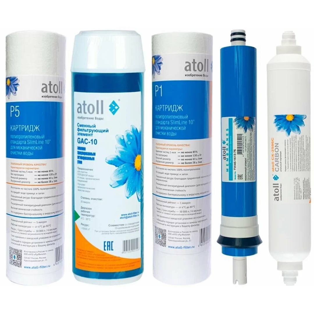 | Минусы: | В данном наборе синяя мембрана (или фильтр) не той фирмы, что заявлена на картинке (filmtec). В наборе пришла мембрана atoll. |