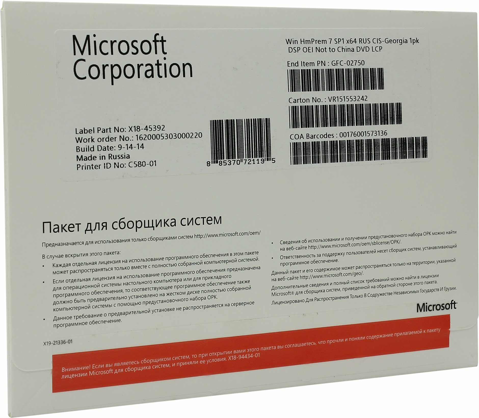 Microsoft Windows 7 Home Premium Russian DVD