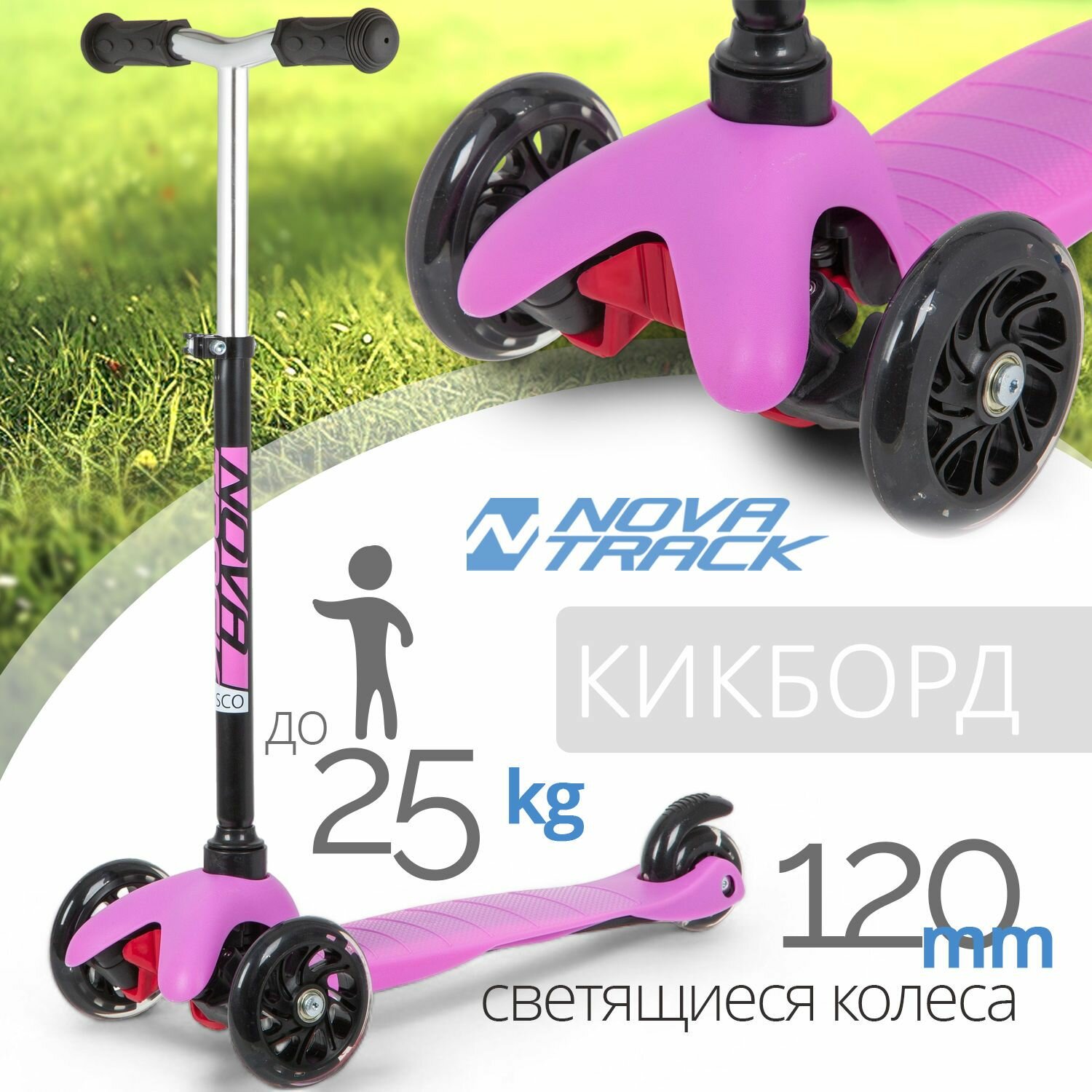 NOVATRACK 120H.DISCOKIDS.PN20 Самокат 3-х колесный 120/80 мм Кикборд детский Disco-kids пластиковый не складной 25 кг розовый Novatrack 120H.DISCOKIDS.PN20