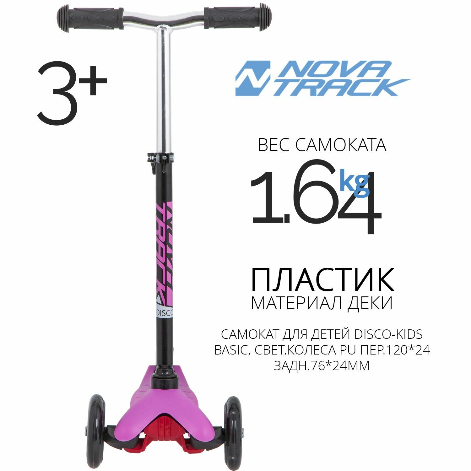 Самокат Novatrack Disco-kids Basic для детей, свет.колеса PU пер.120*24 задн.76*24мм, эргономичный быстросъемный Y-руль с нескладными рукоятями, регулируемый по высоте, черно-розовый