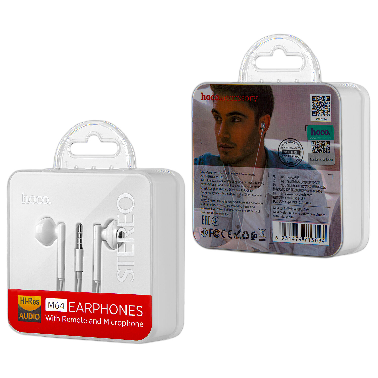 Наушники M64 Melodious wire control earphones, HOCO, белые