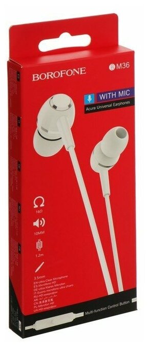 Наушники Borofone BM36 Acura, вакуумные, микрофон, Jack 3.5 мм, кабель 1.2 м, белые Borofone 9088680