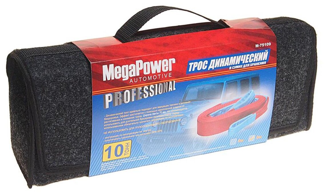 MEGAPOWER-AUTOMOTIVE M-75109 Трос буксировочный 10т 9м ленточный динамический (петля-петля) в сумке MEGAPOWER