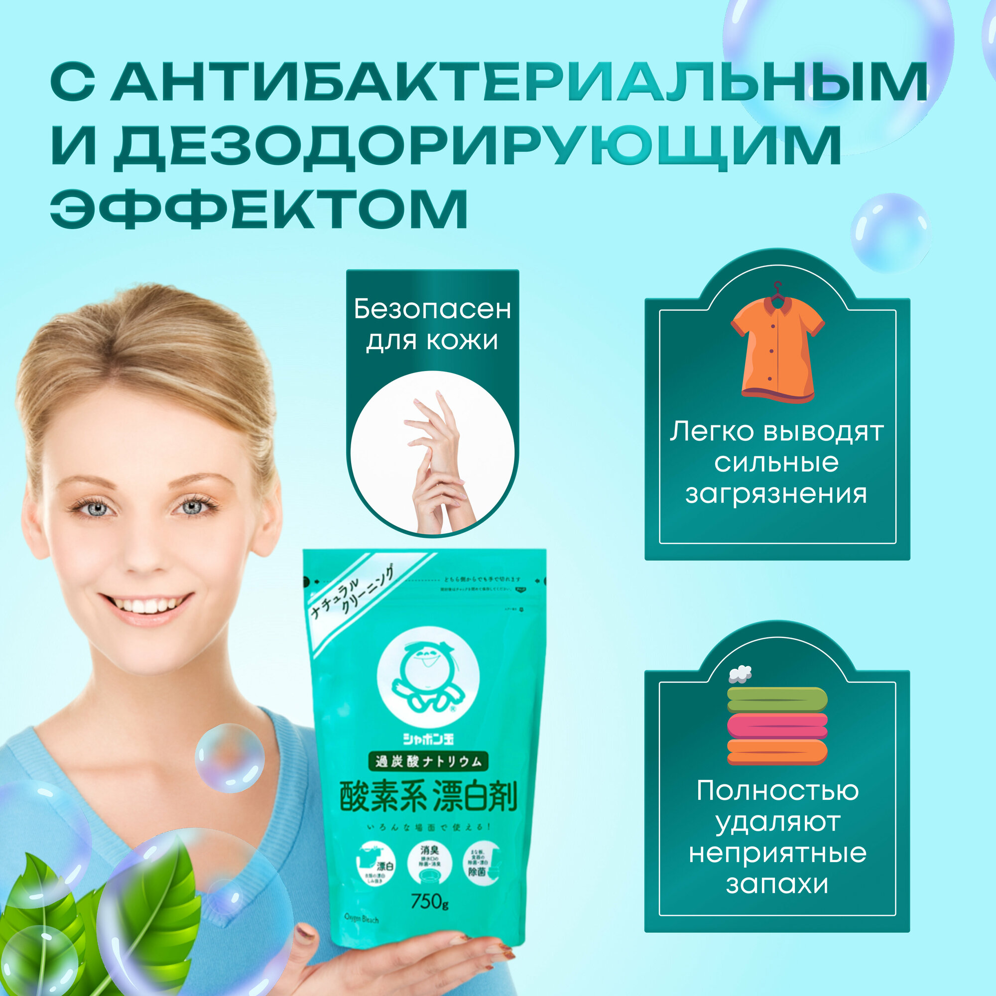 Антибактериальный дезодорирующий кислородный отбеливатель-пятновыводитель Shabondama, 750 г, Япония / Эко средство для стирки вещей, гипоаллергенное, без отдушки