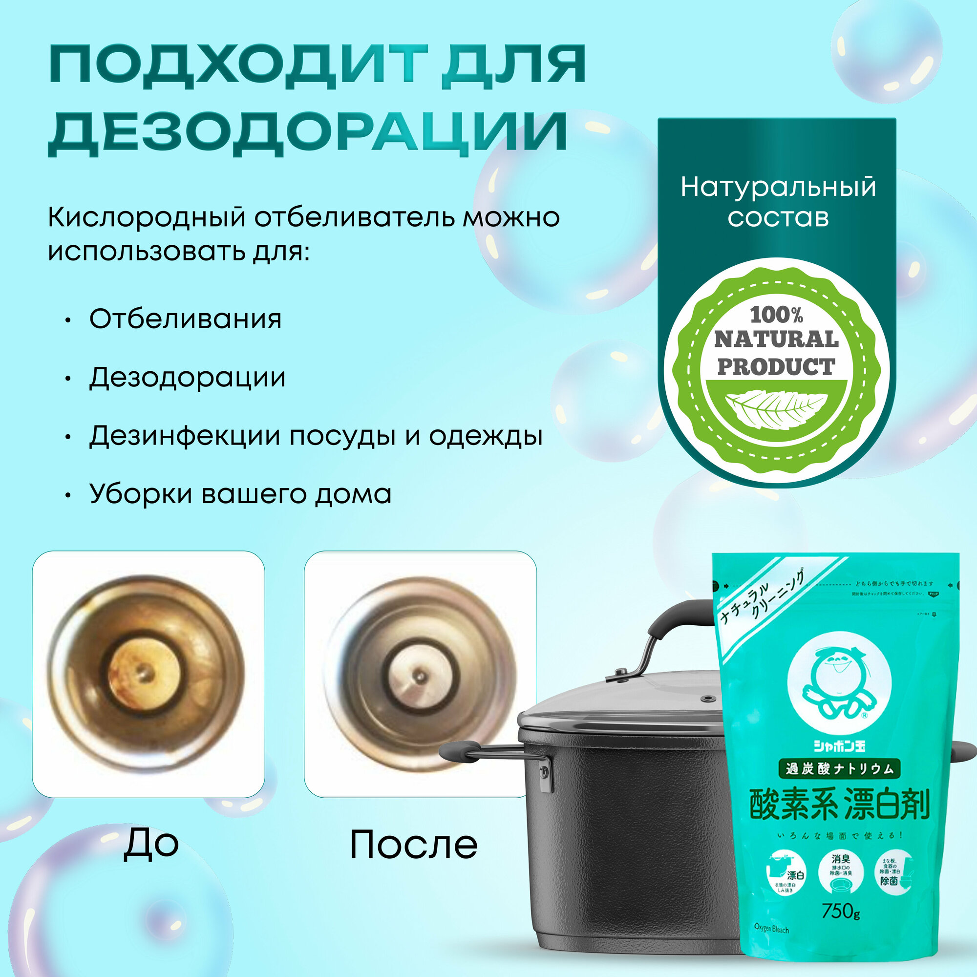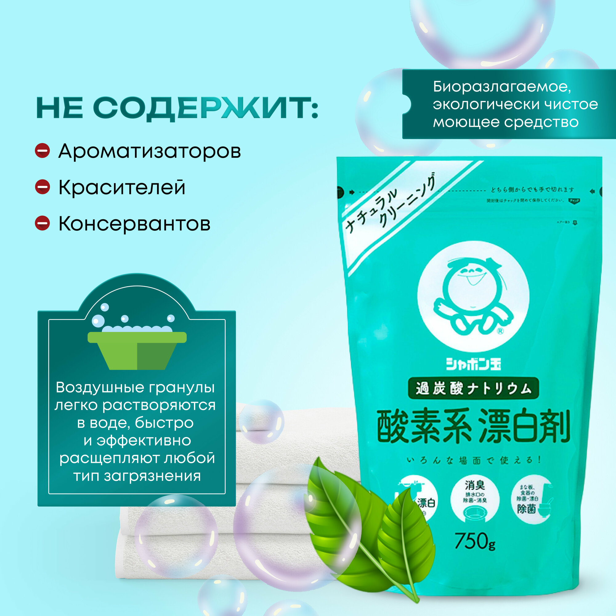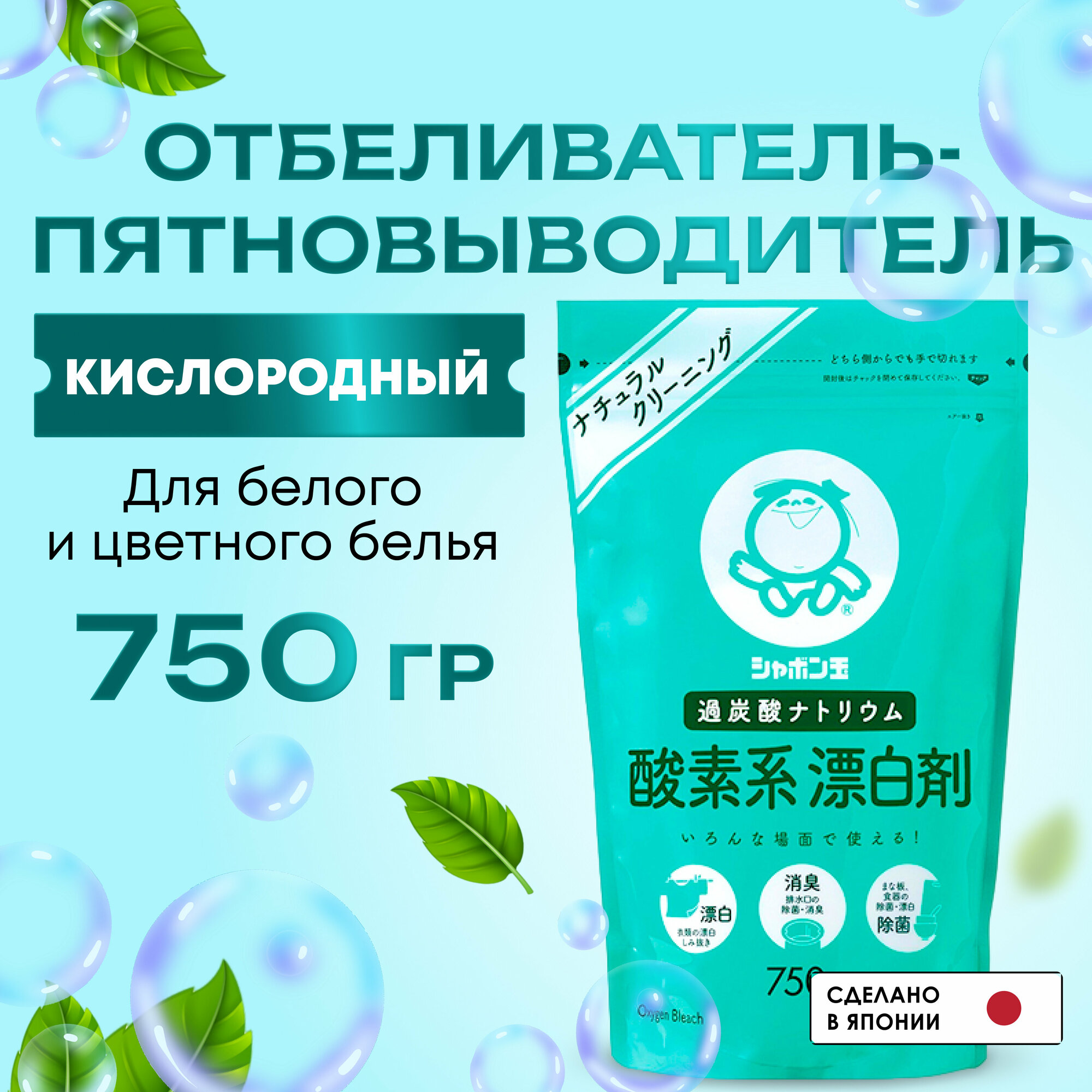 Кислородный отбеливатель пятновыводитель Shabondama 750 г. Антибактериальный гипоаллергенный Япония, Перкарбонат натрия для белого и цветного белья