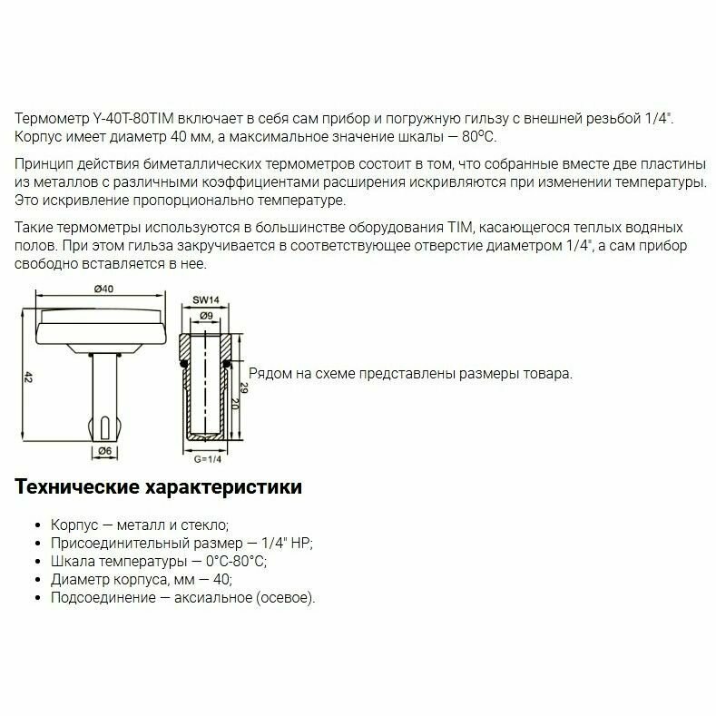 Термометр "малый", аксиальный с погружной гильзой 1/4" (0-80 С), TIM Y-40T-80