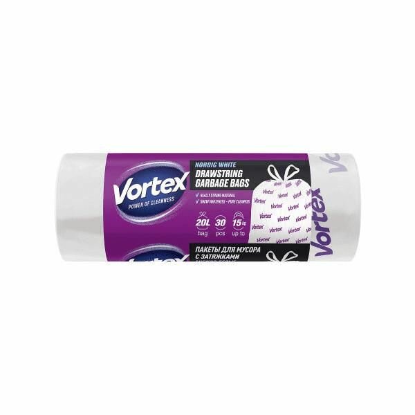 Купить Пакеты для мусора VORTEX "HD", с затяжкой, 45х50 см, белые, 18 мкм, 20 л, 30 шт (16119540)