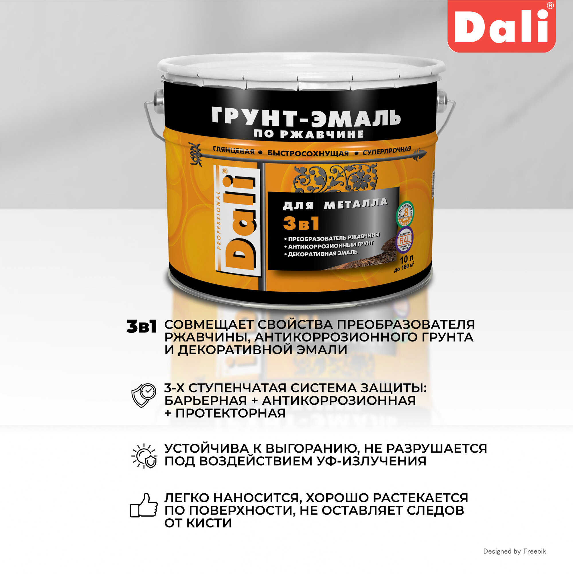 Dali / Дали Грунт-эмаль по ржавчине 3 в 1 гладкая алкидная RAL 9006 Серебристый алюминий 10л