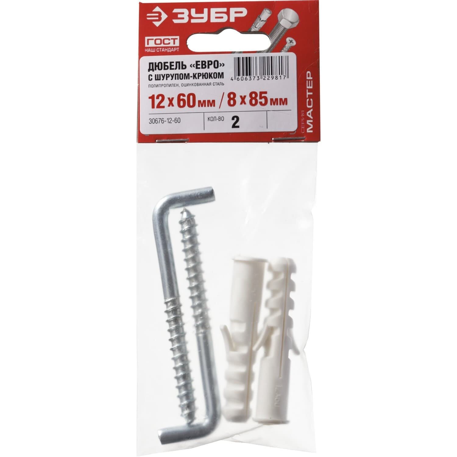 Купить ЗУБР евро 12х60 / 8х85 мм, распорный дюбель полипропиленовый с шурупом-крюком, 2 шт (30676-12-60)