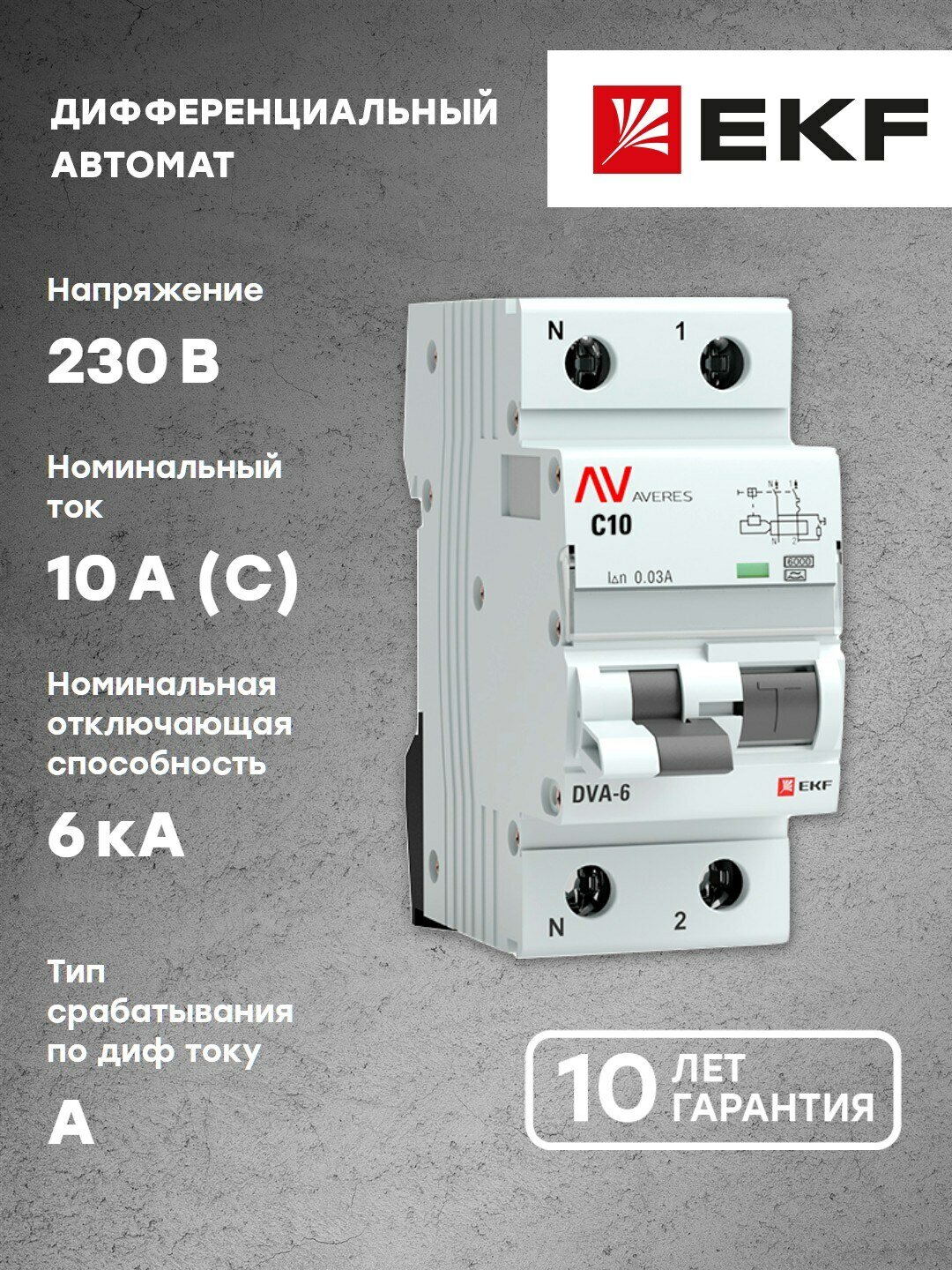 Автомат дифференциальный EKF Averes DVA-6 10А 30 мА 1P+N Тип А 6 кА (rcbo6-1pn-10C-30-a-av)