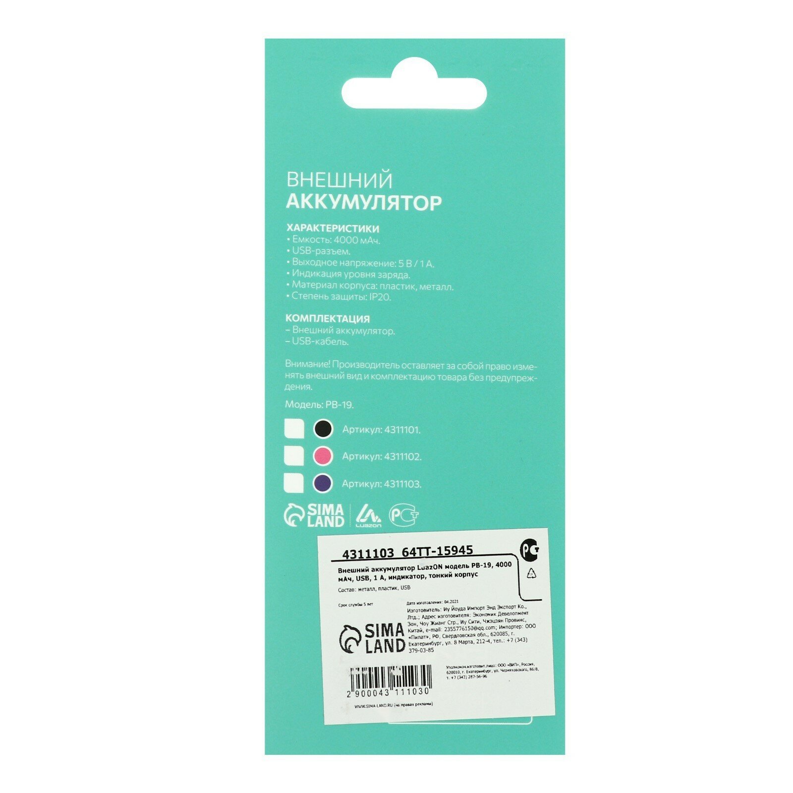 Внешний аккумулятор LuazON Pb-19, 4000 мАч, Usb, 1 А, индикатор, металл, синий Luazon Home 4311103 .