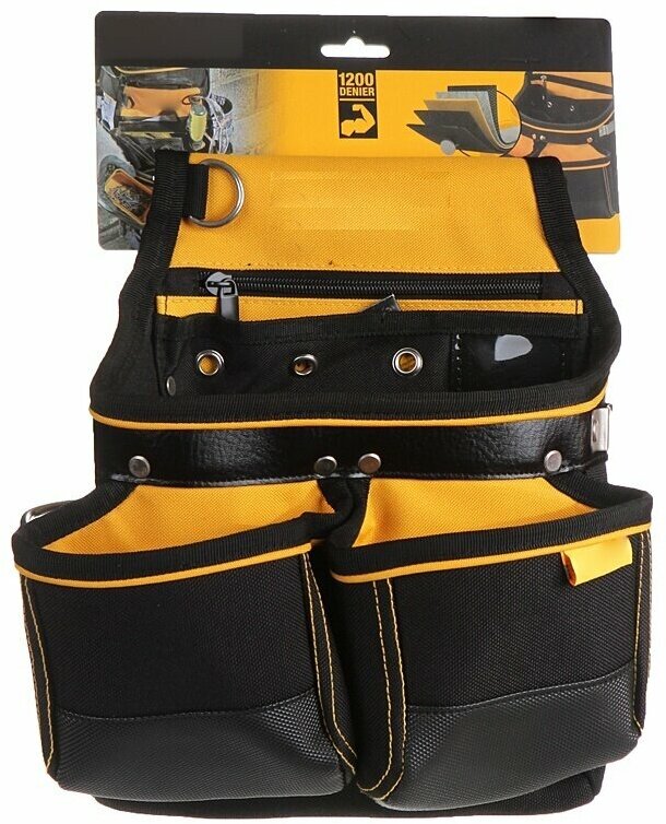 | Плюсы: | Качественный крепкий материал, большой размер самой сумки по сравнению с моим стареньким stayer. В два маленьких кармана свободно встают оранжевые болксы из системы хранения DeWalt. На одной сумке и крепление под рулетку, и скоба для молотка и скобы для карабинов ручного инструмента. |