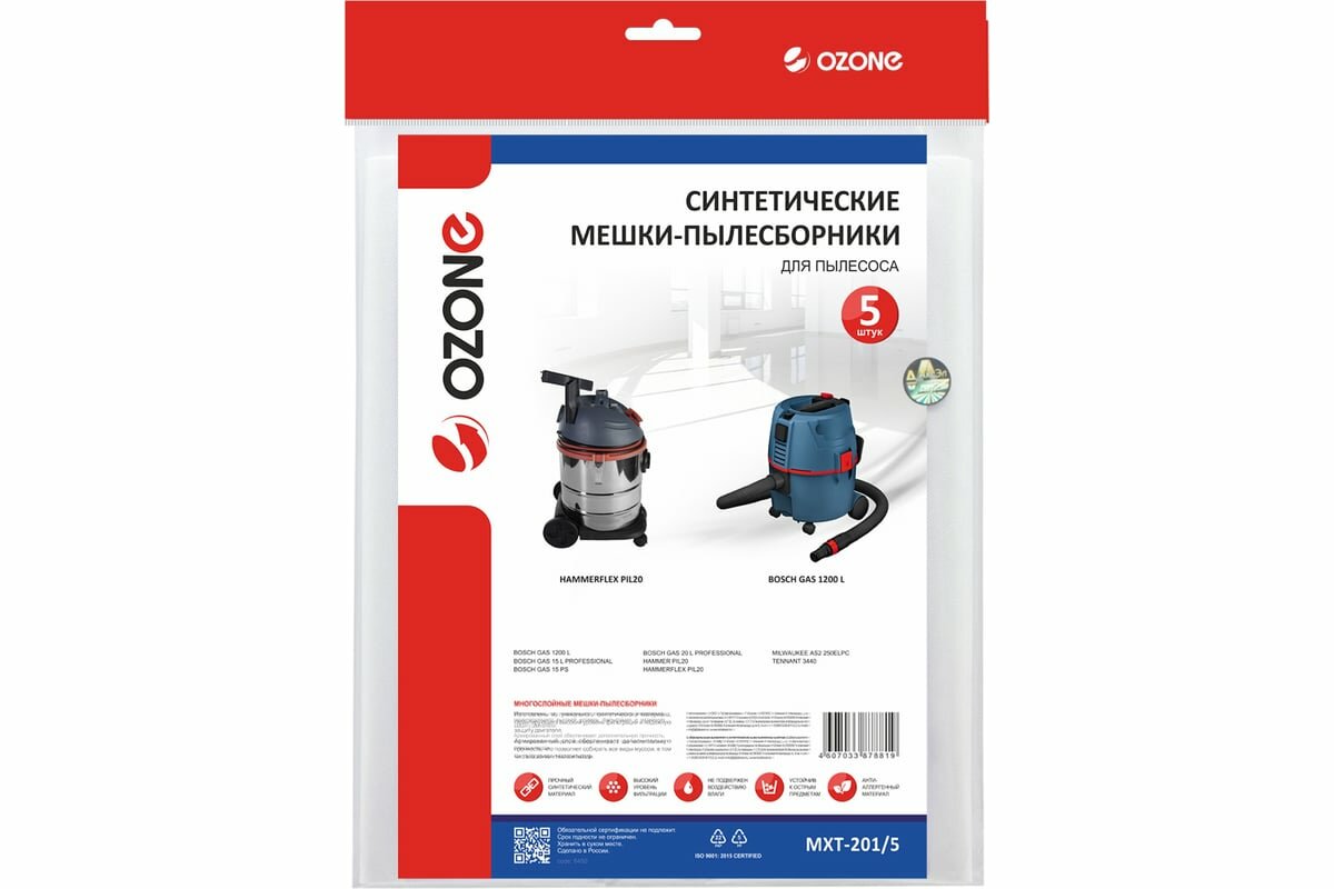 Синтетические мешки-пылесборники Ozone MXT-201/5 для пылесоса BOSCH GAS 15, GAS 20, FLEX, HAMMER, 5 шт