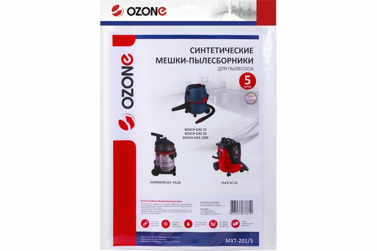 Мешки-пылесборники Ozone MXT-201/5 5шт для Bosch Gas 15/20/Flex/Hammer
