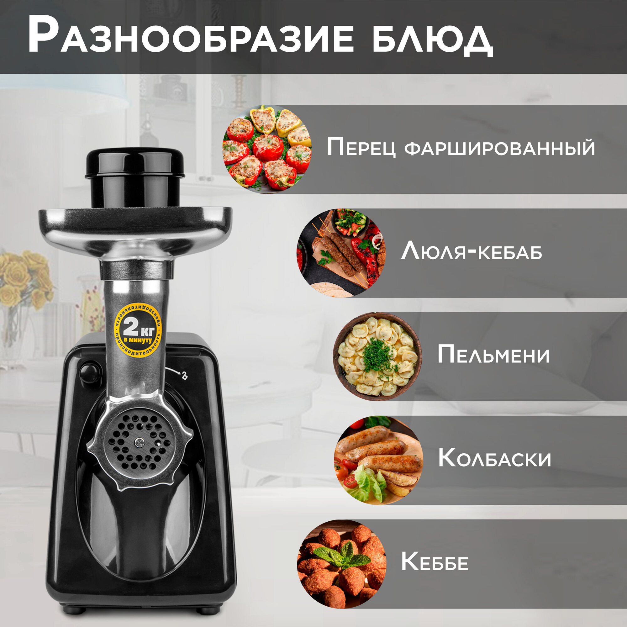 | Диск для фарша | 3 в комплекте, диаметр отверстий 3 мм, 5 мм, 7 мм |