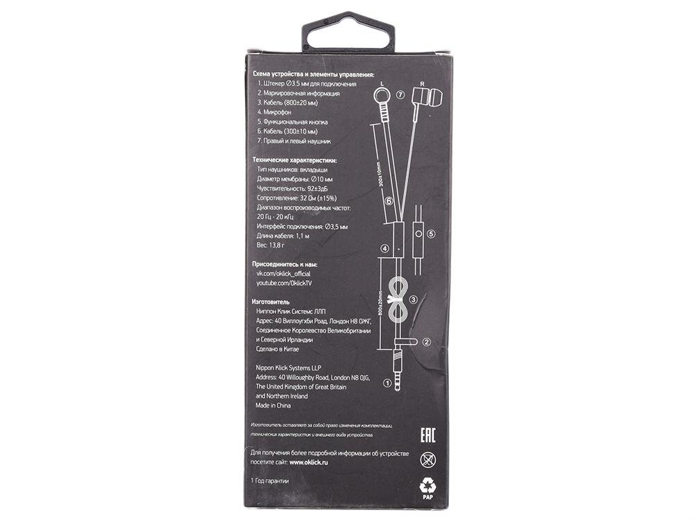 Гарнитура Oklick HS-S-220, 3.5 мм, вкладыши, черный [d2b]