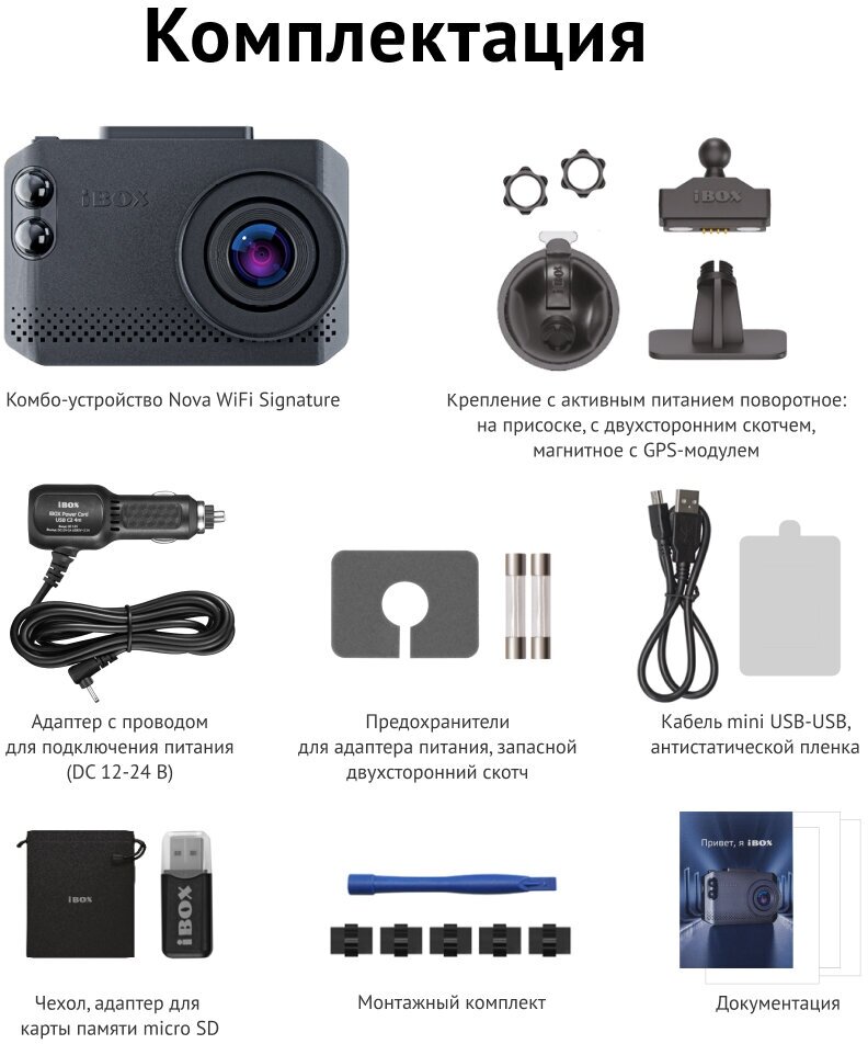 | Дополнительная информация | GPS / Глонасс база полицейских радаров РФ, Европы и СНГ; функция АнтиСон; режимы работы радар-детектора: Турбо, Трасса, Город, Тихий город, Мегаполис, Смарт; диапазоны радар-детектора: прием радаров СТРЕЛКА СТ/М, Х - 10475 - 10575 МГц, К - 24050 - 24250 МГц, Ка - 33400 - 36000 МГц, лазер - 800-1100 нм; комплектация: комбо-устройство Nova WiFi Signature, поворотное крепление на присоске, инсталляционный комплект, адаптер с проводом для подключения питания (DC 12-24 В), предохранители для адаптера питания, адаптер для карты памяти micro SD, USB-провод, чехол, руководство пользователя, памятка пользователя, гарантийный талон |