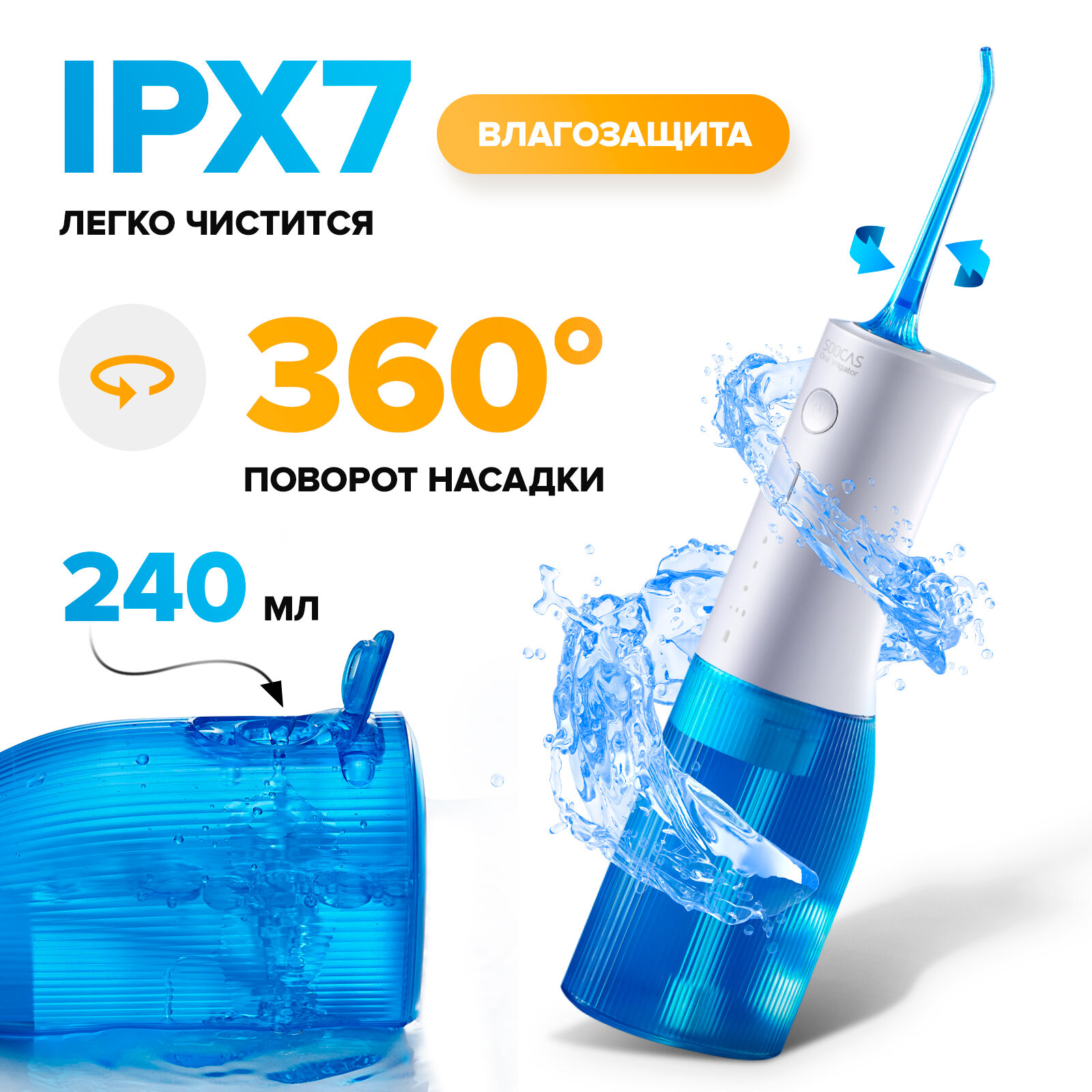 Ирригатор для полости рта Soocas W3 PRO (Ростест), Портативный (4 насадки, кейс для насадок в комплекте), 7 режимов, голубой интересное: