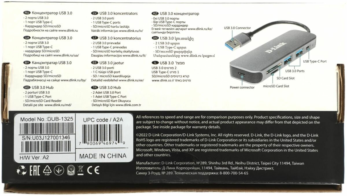 D-Link Сетевое оборудование DUB-1325 A2A Концентратор с 2 портами USB 3.0, 1 портом USB Type-C, слотами для карт SD и microSD и разъемом USB 3.0