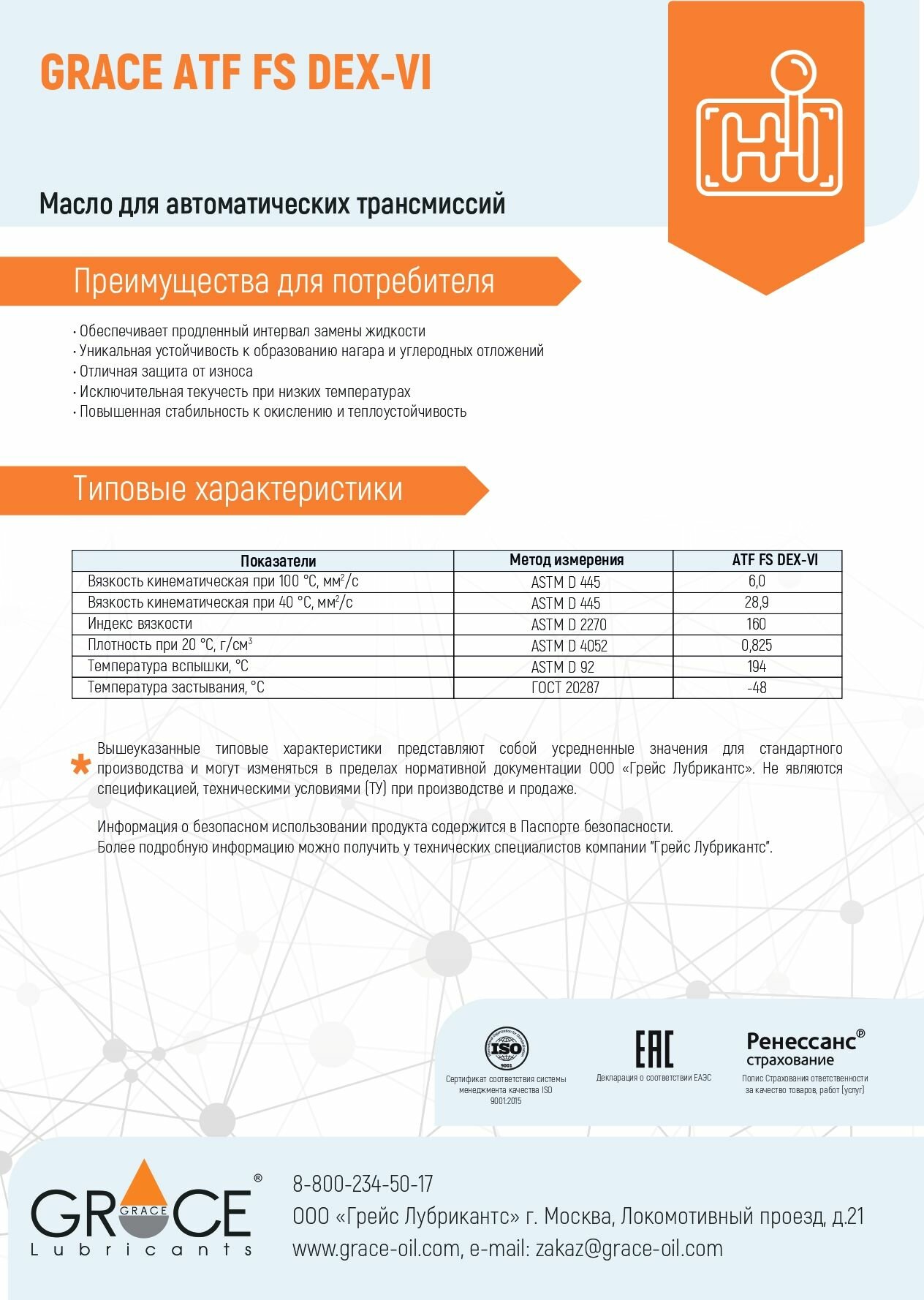 GRACE-OIL 4603728818627 Масо трансмиссионное ATF DEXRON VI FS дя АКПП 4 GRACE