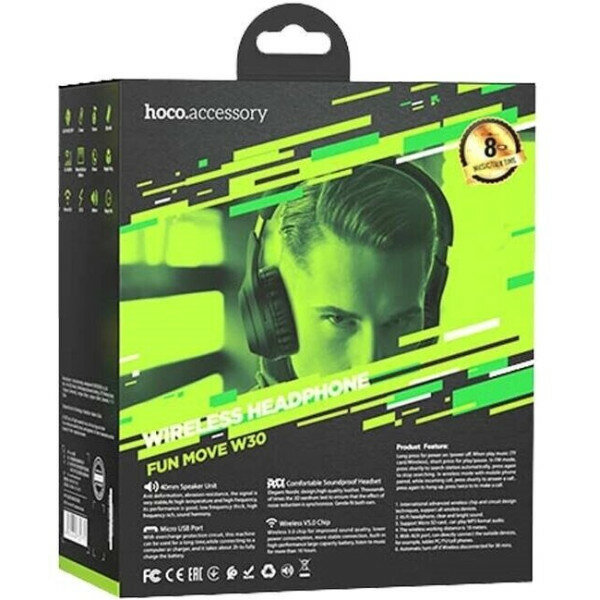 Наушники беспроводные, полноразмерные с микрофоном Bluetooth, 300mAh, 8 часов музыки, TF карт, AUX hoco. W30 Fun move - черный
