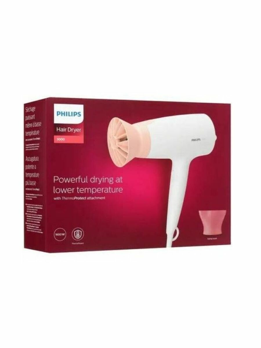 Фен Philips/ 1600 Вт, 3 режима, насадка ThermoProtect, концентратор, шнур 1,8 м. Цвет: белый с розов