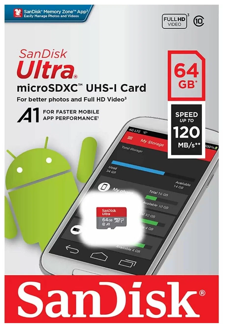 Карта памяти SanDisk microSDXC 64 ГБ Class 10, A1, UHS Class 1, R 120 МБ/с