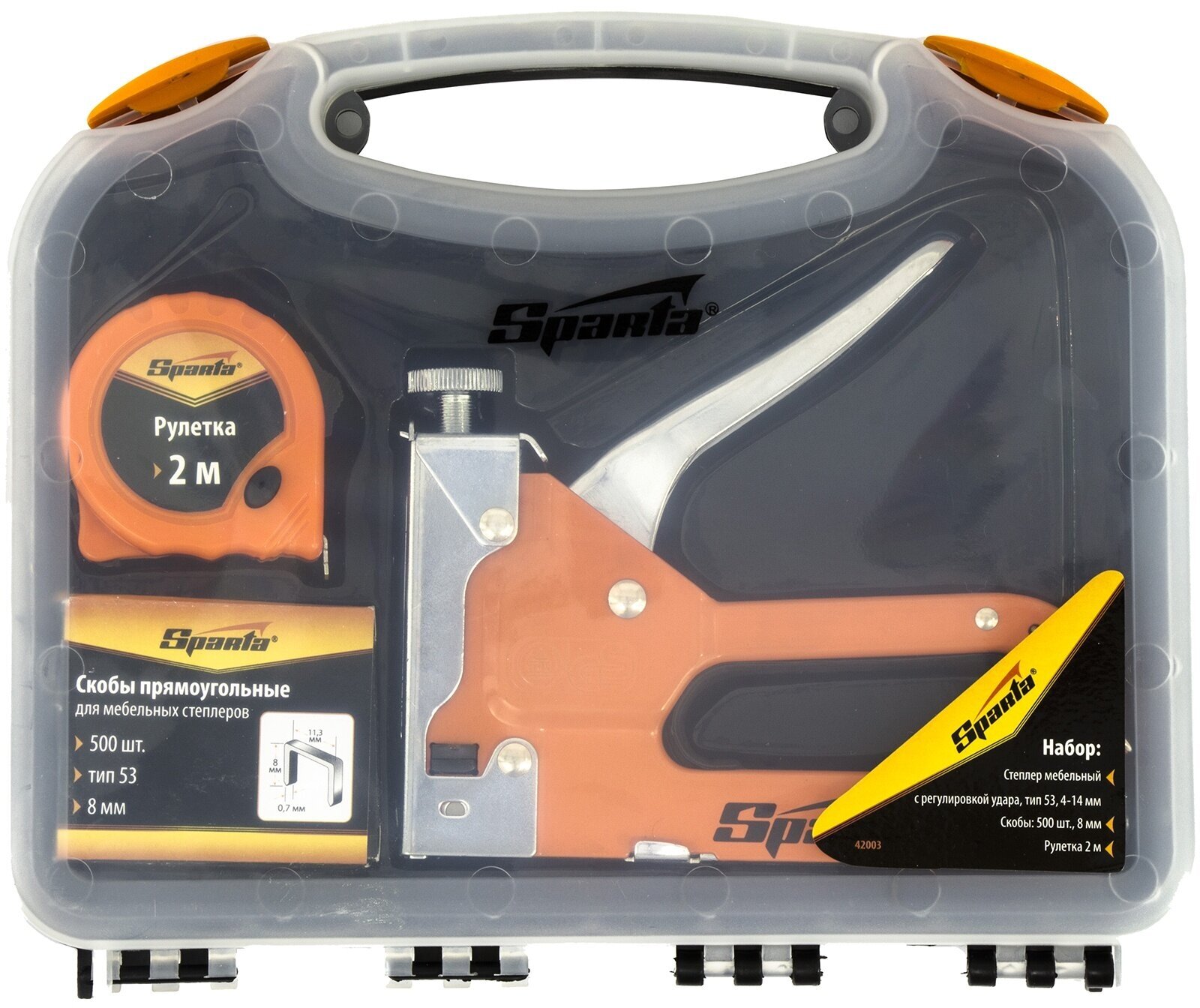 Набор: Степлер Мебельный Регулируемый, Скобы 500 Шт, Рулетка 2м., Тип Скобы 53, 4-14 Мм// Sparta Sparta арт. 42003
