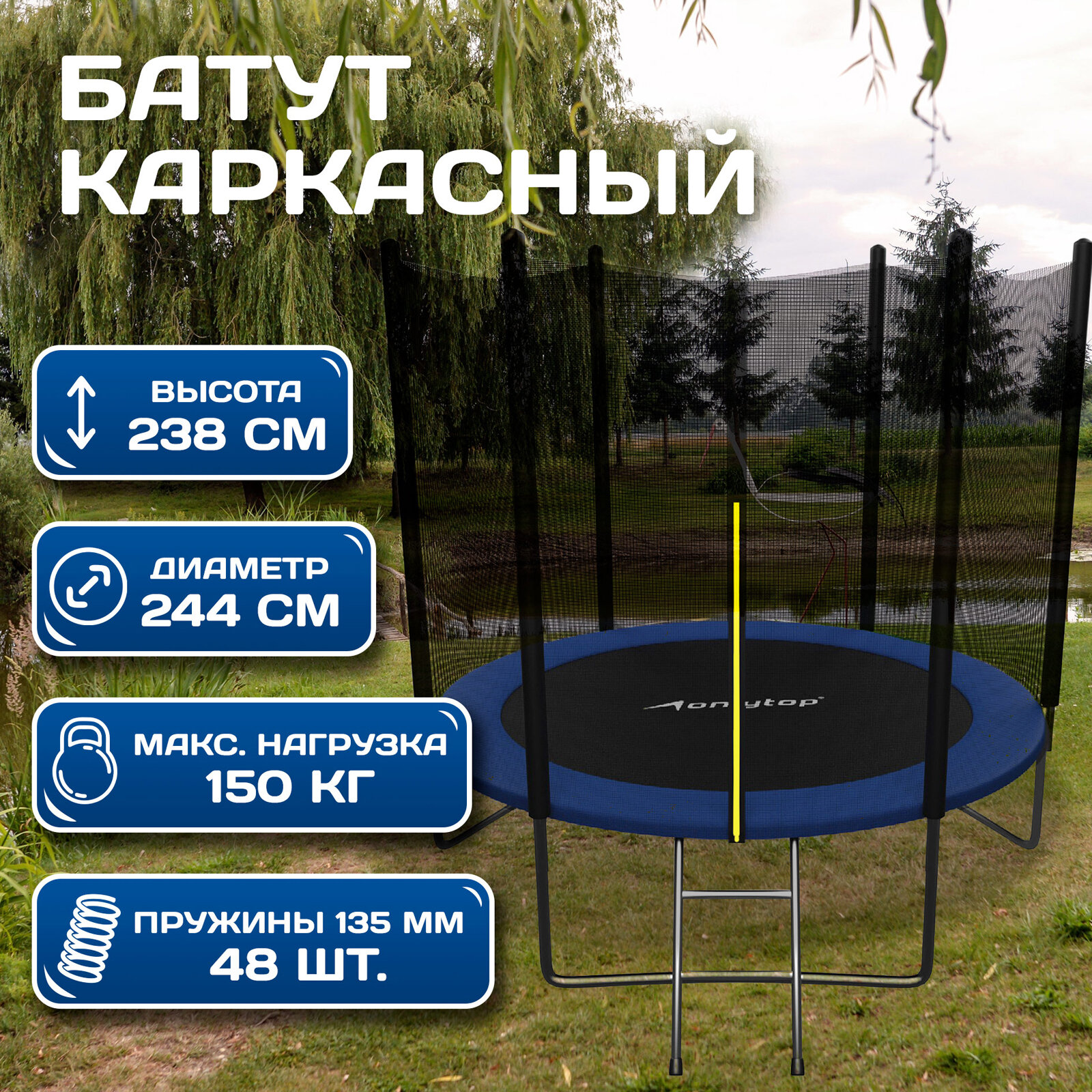 Батут ONLITOP, диаметр 244 см, с внешней защитной сеткой (173 см) и лестницей, максимально допустимый вес 150 кг, цвет синий