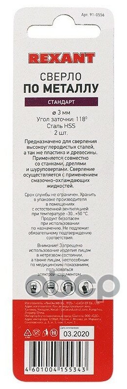 REXANT Сверло по металлу 3,0 мм HSS (2 шт. в упаковке) цена за уп-ку DIN 338, (300!)91-0556
