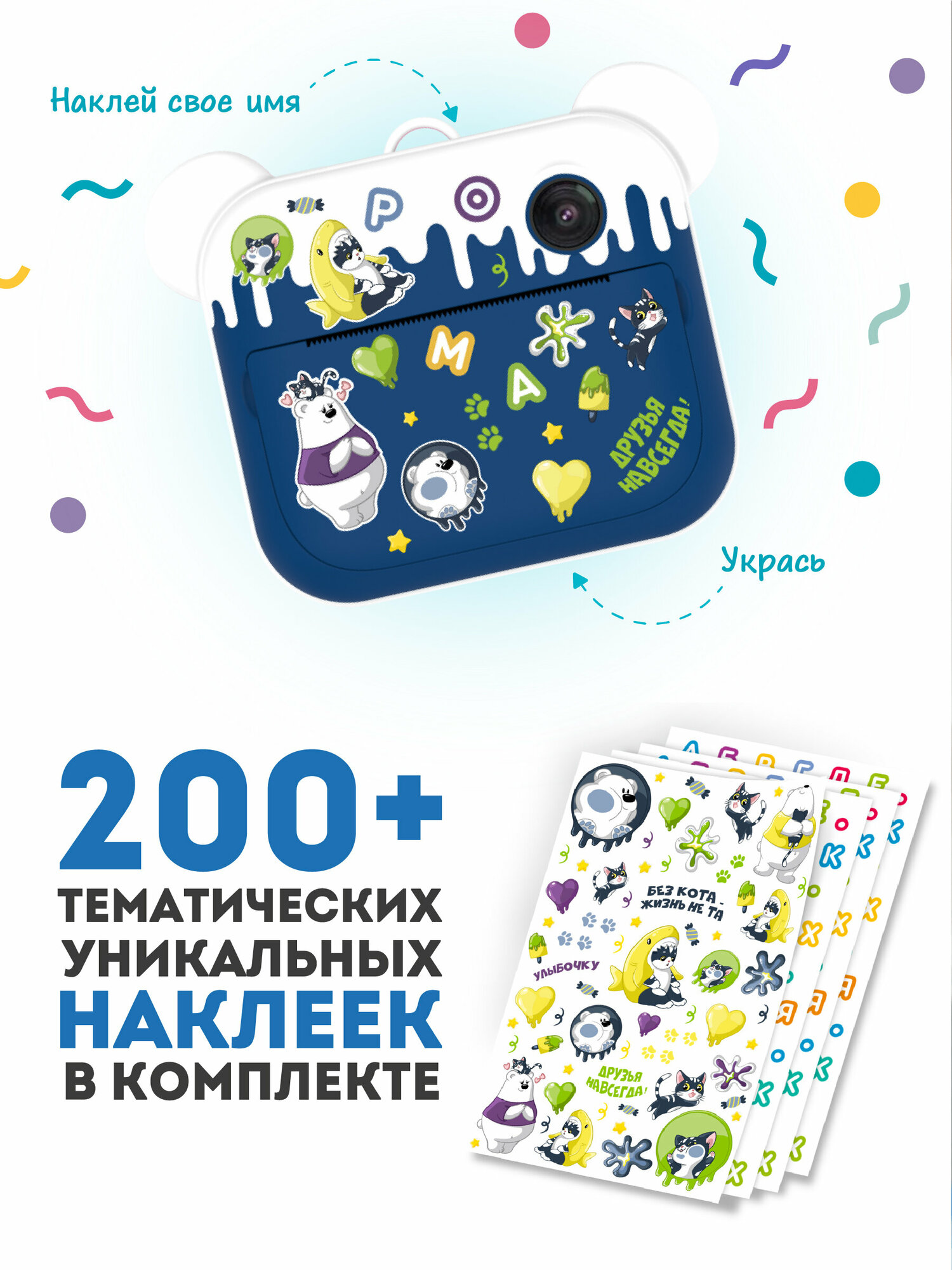 Хорошой экран, приятные цветв, удобство в использовании, печать достаточно хорошая, по мне качественная))) на сколько это возможно. Прост в использовании, имеет режим селфи, наложение масок ? Есть в комплекте наклейки, котррые можно нанести на фотоаппарат. Не пожалели, что взяли именно его! |