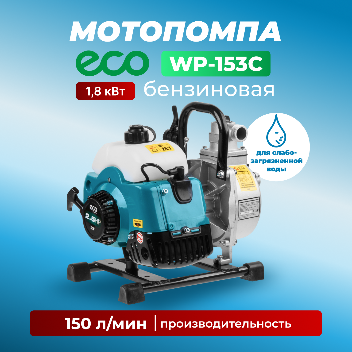 Мотопомпа бензиновая ECO WP-153C (для слабозагрязненной воды, 1,8кВт, 150 л/мин, 2-х такт)