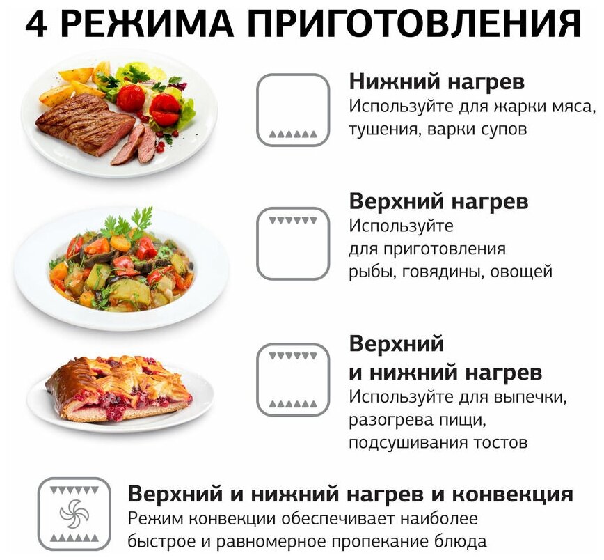 | Плюсы: | Ручная регулировка температуры; режимы приготовления; обьем камеры 36 л; потребляет мало света. |