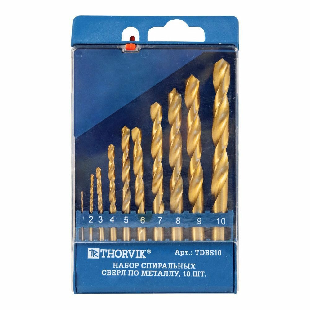Набор сверл по металлу HSS TiN Thorvik 10 шт. 1,0-10,0 мм пластиковый футляр THORVIK TDBS10 | цена за 1 шт