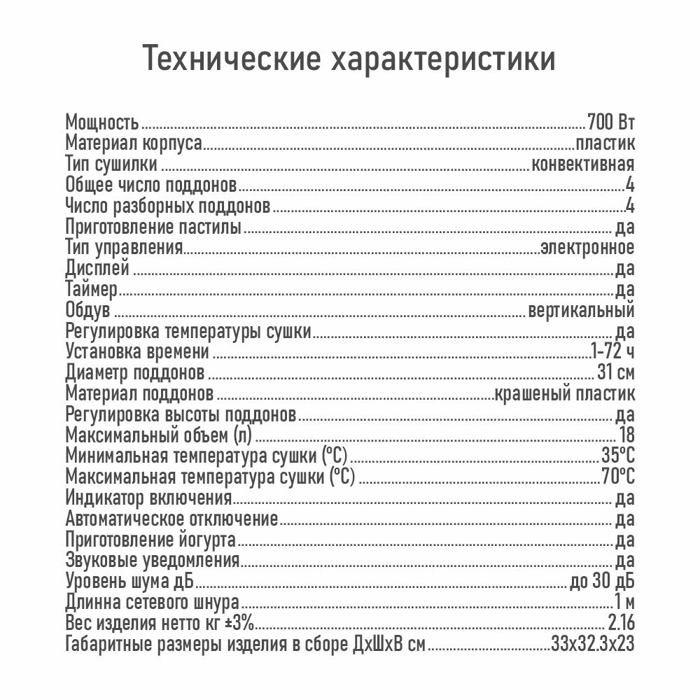 | Отзыв: | Максимально простая сушилка, есть несколько кнопок для настройки и запуска и все. Это важно, так как я ее покупала для бабушки, они всю новую, современную технику не признает. Сушила фрукты раньше по старинке в духовке. Но тут все просто, пару раз показала как запускать и она сама справляется. Хорошая вместительность, длинный шнур, электричества мотает не много. |