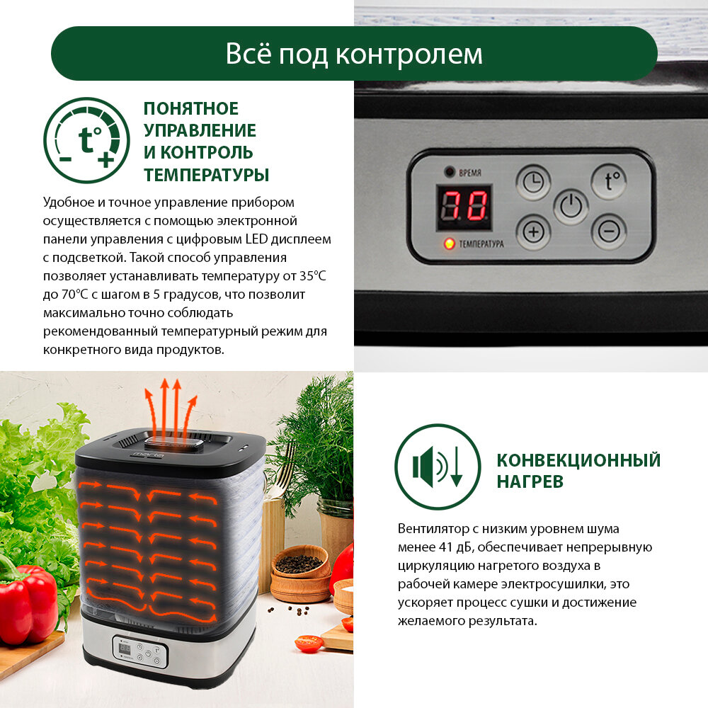 | Плюсы: | Сушка работает хорошо, пробовали сушить траву, ягоды. |