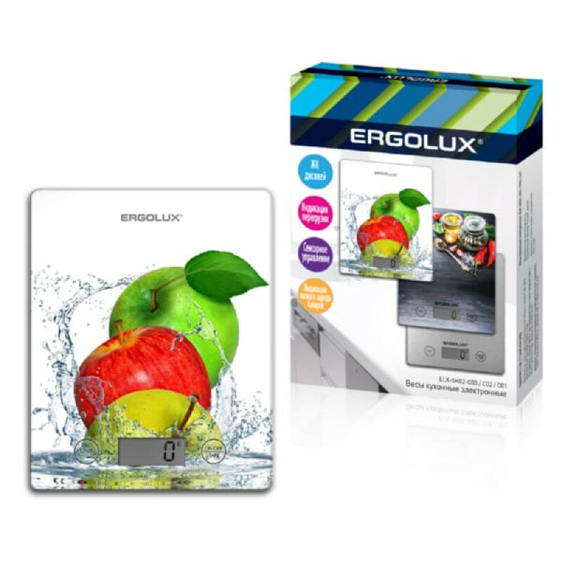 Купить Весы электронные кухонные ERGOLUX ELX SK02-C01 белые,яблоки до 5 кг,195142мм ЖК дисплей, индикация перезагрузки, сенсорное управление, индикация низкого заряда батареи.