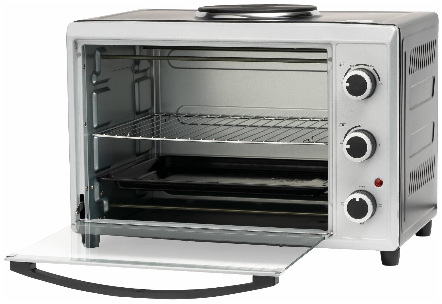 GALAXY LINE GL 2602 Мини-печь с одной конфоркой, объем 38л, 3000 Вт (мощность духовки 2000 Вт, мощность конфорки 1000 Вт), диаметр конфорки 185 мм ,3 режима работы духовки, дверца из жаропрочного стекла, регулировка температуры духовки от 100 °С до 250 °С