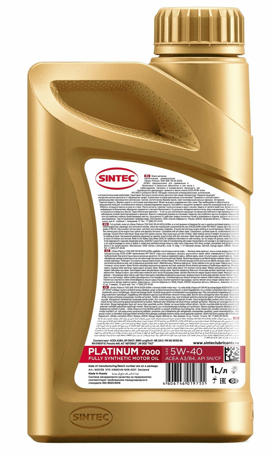 Синтетическое моторное масло SINTEC PLATINUM 7000 5W-40, 1 л, 1 шт.