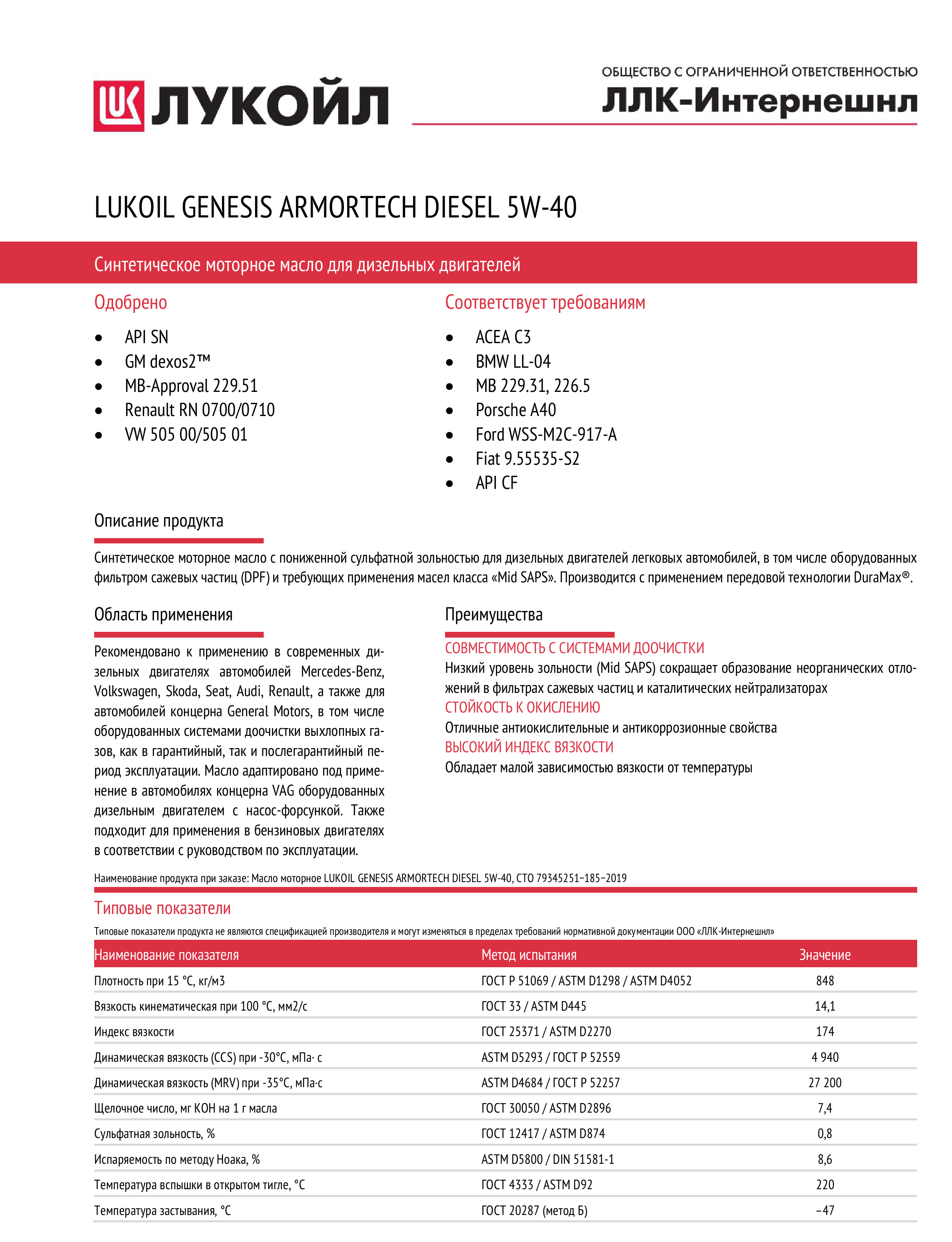 масло лукойл 5w40 genesis armortech diesel api sn acea c3 1л син