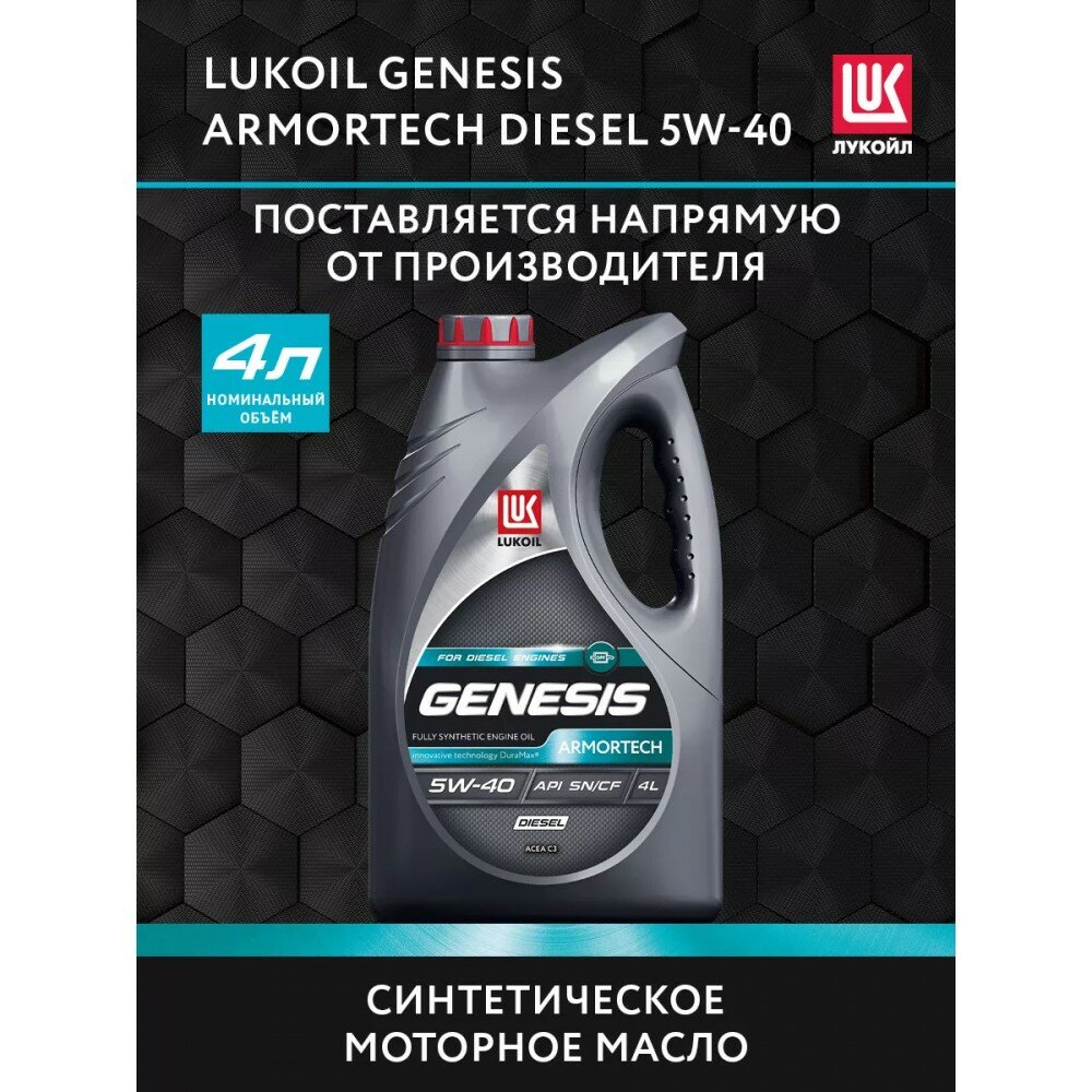 Масло моторное Лукойл Genesis Armortech Diesel 5w40, синтетическое, API SN/CF, ACEA C3, для дизельного двигателя, 4л, арт. 3149129