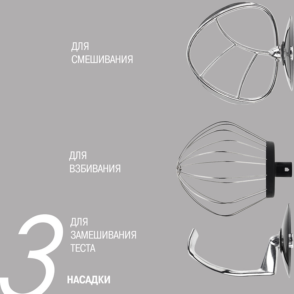 | Плюсы: | в комплекте крючки для замешивания теста, венчик для взбивания, насадка для приготовления пюре. |